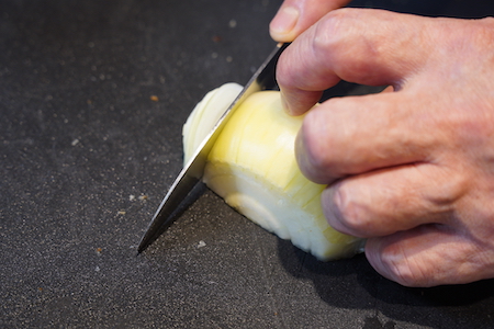 ⑥ 牛ステーキ肉を取り出したフライパンに残りのバター10gを溶かし、薄切りにした玉ねぎを入れて炒める。