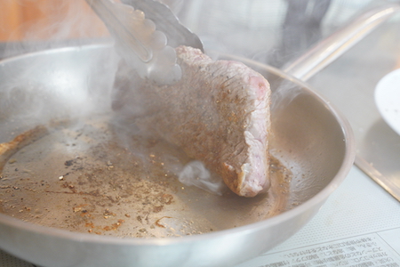 ④ バターが溶けたら牛ステーキ肉を入れて中火にし、片面1分ずつ焼く。
