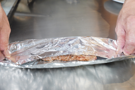 ⑤ 両面に焼き目がついたらフライパンから牛ステーキ肉を取り出してアルミホイルで包み余熱で火を通す。