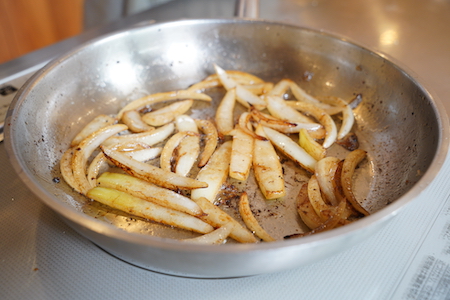 ⑦ 玉ねぎがあめ色になったら火を止め、フライパンの余分な脂をキッチンペーパーでふき取る。