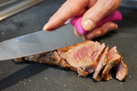 ⑧ アルミホイルから牛ステーキ肉を取り出し、好みの厚さにスライスする。