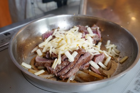 ⑨ 玉ねぎが入ったフライパンにスライスした肉を戻し、チーズを入れて弱火で炒める。強火だとチーズが分離してしまい焦げやすくなるため、できるだけ弱火で。
