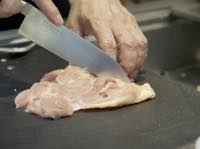 ❶ 赤玉ネギをスライスし、鶏肉を一口大に切る。