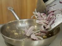 ❹ スパイスの香りが出てきたら、❶でスライスした玉ネギを入れて飴色になるまで炒めて火を止める。