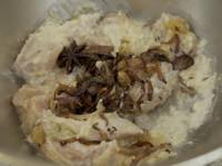 ❺ ❶で切った鶏肉をボールに入れ、❹とカイエンヌペッパーを入れて混ぜる。