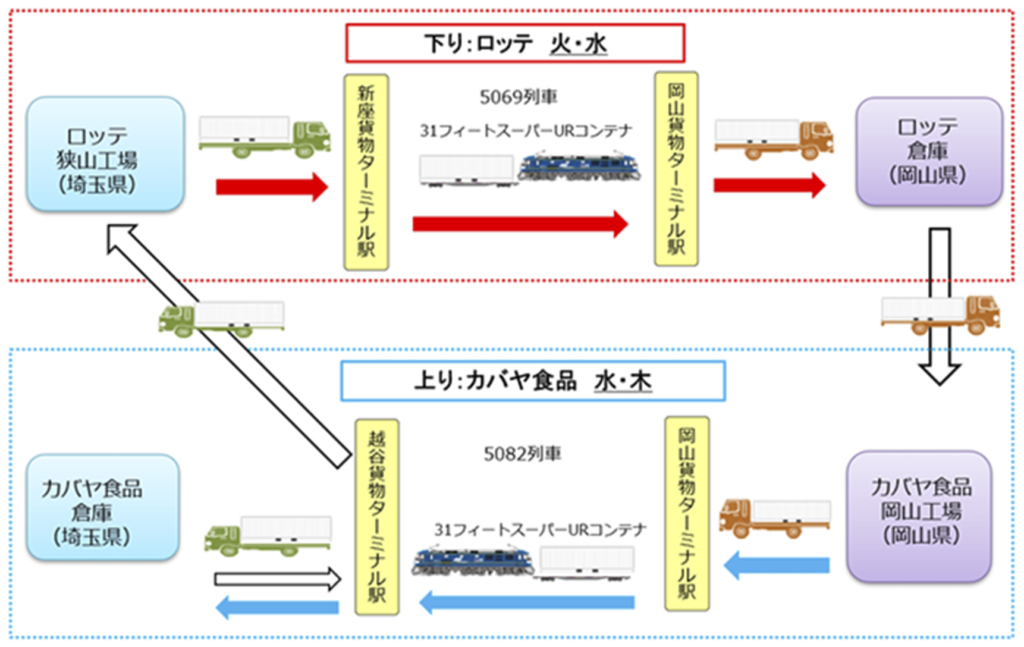 リンク&リンケージは物流の課題(2024年問題とカーボンニュートラル等)解決が求められる中、持続可能な輸送網構築がメーカーにとっても重要である考えたため、カバヤ食品とロッテ、日本貨物鉄道と2023年1月から協議を開始し、その後、7社が連携して同年7月に輸送の運用が始まりました。埼玉にあるロッテの工場から岡山の物流拠点までのトラック輸送とカバヤ岡山工場から埼玉の物流拠点までのトラック輸送を共に鉄道輸送に転換しました。さらに31ftスーパーURコンテナを往復利用することで物流の効率化に寄与し、CO2の排出量が7割以上の削減につながり、持続可能な輸送網構築を実現しました。