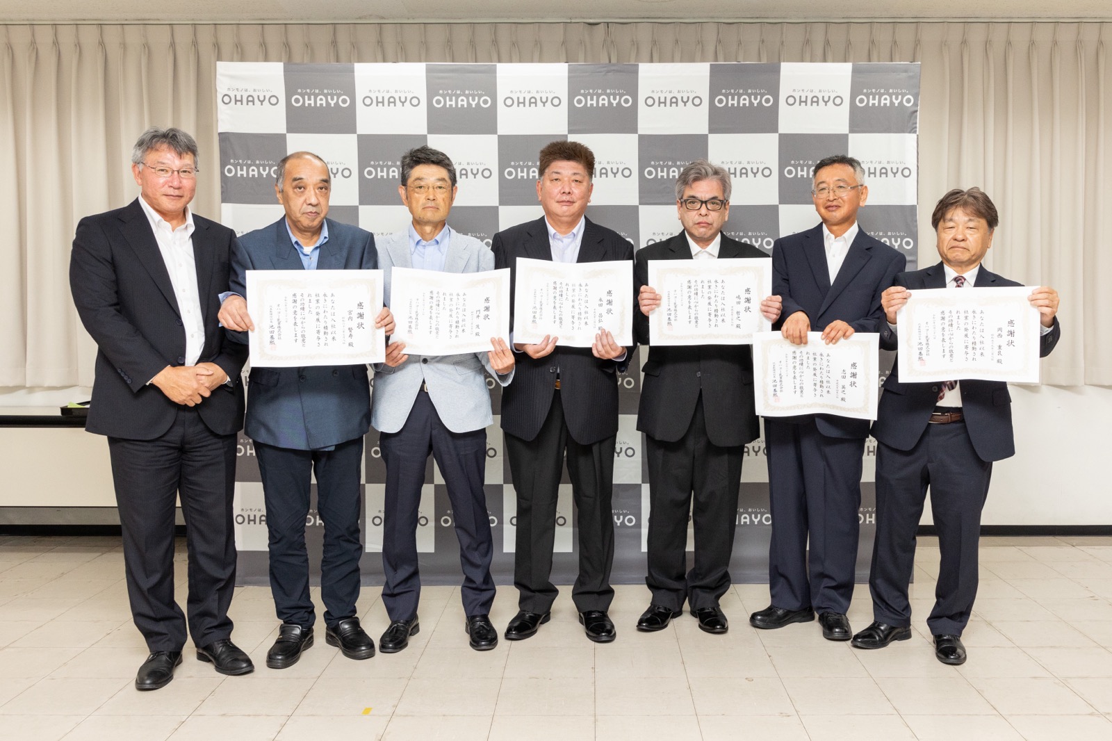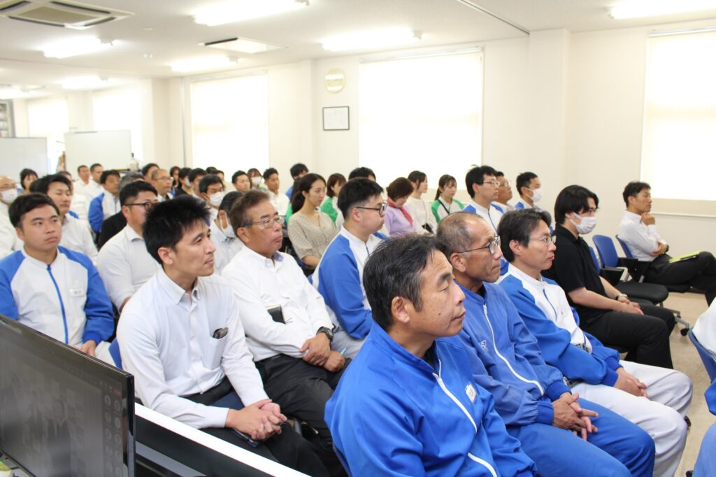 当日は、長期にわたり会社を支えてきてくださった先輩方に永年勤続の感謝状を贈呈。今回表彰された方の中には、操業当時からご勤務されている社員もいらっしゃいます。式の中では、本社、長船工場、営業部門、そして関東工場を代表して登壇された8名の先輩方から当時の状況や今後に向けたメッセージをいただきました。