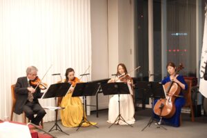 新年を明るい雰囲気でお祝いできる環境として、今回はグループで応援している岡山フィルハーモニック管弦楽団から4名の方をお招きし、生演奏を聴きながら、食事とお酒を楽しみました。