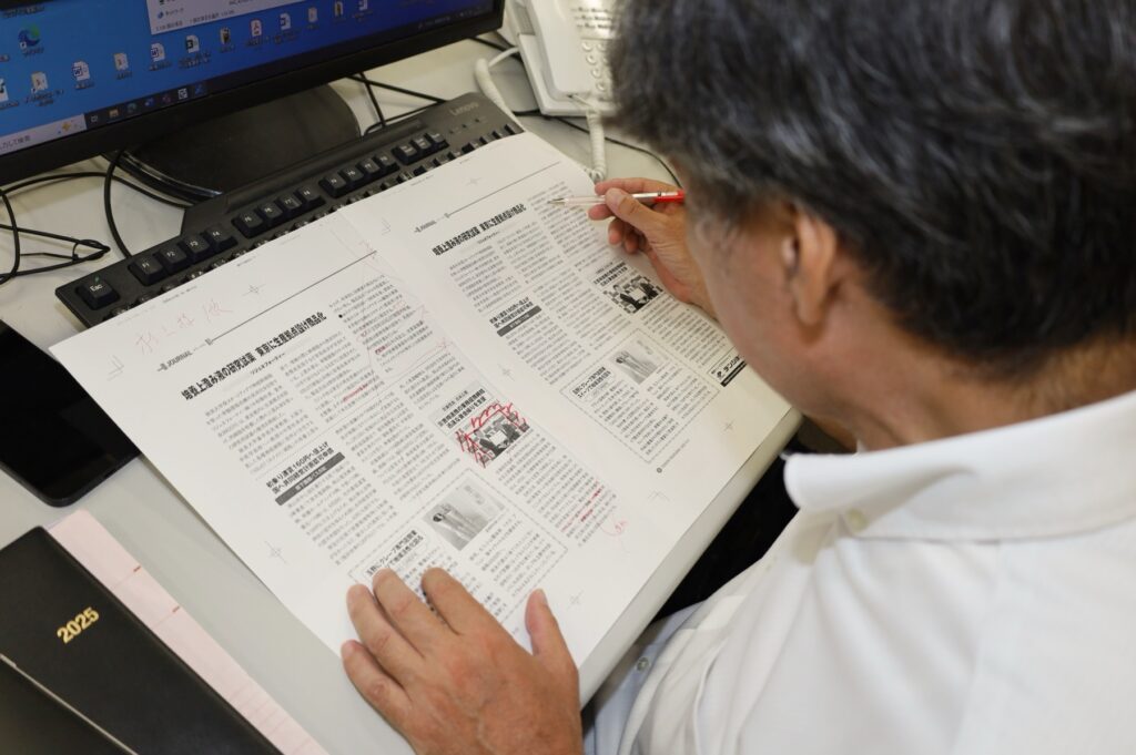 校正(行数調整や、記事に誤りがないか、表現が分かりにくくないかなどを記者全員で相互にチェックします)